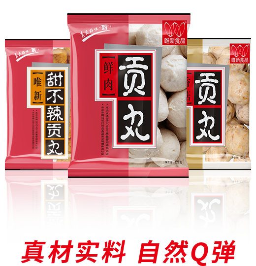 • 選擇蛋白質含量及新鮮度高的豬后腿肉為原料,模擬手工捶打的打漿工藝,再經煮制、冷卻、速凍工藝才可生產出自然脆彈的唯新貢丸,是居家佐餐、火鍋的美味食品。近年來我們還研發(fā)生產了香腸、蝦滑、魚丸、牛肉丸等大眾喜愛的家庭火鍋料速凍食品。